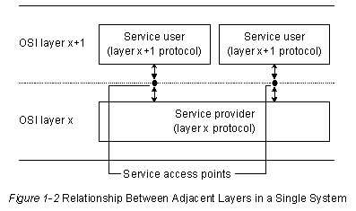 Предположим, что Уровень 4 Системы А должен связаться с Уровнем 4 Системы В. Чтобы выполнить эту задачу, Уровень 4 Системы А должен воспользоваться услугами Уровня 3 Системы А. Уровень 4 называется "пользователем услуг", а Уровень 3 - "источником услуг". Услуги Уровня 3 обеспечиваются Уровню 4 в "точке доступа к услугам" (SAP), которая представляет собой просто местоположение, в котором Уровень 4 может запросить услуги Уровня 3. Как видно из рисунка, Уровень 3 может предоставлять свои услуги множеству об'ектов Уровня 4.