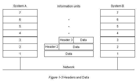 Концепция заголовка и собственно данных относительна и зависит от перспективы того уровня, который в данный момент анализирует информационный блок. Например, в Уровне 3 информационный блок состоит из заголовка Уровня 3 и следующими за ним данными. Однако данные Уровня 3 могут содержать заголовки Уровней 4, 5, 6 и 7. Кроме того, заголовок Уровня 3 является просто данными для Уровня 2. Эта концепция иллюстрируется на Рис. 1-3. И наконец, не все уровни нуждаются в присоединении заголовков. Некоторые уровни просто выполняют трансформацию фактических данных, которые они получают, чтобы сделать их более или менее читаемыми для смежных с ними уровней.